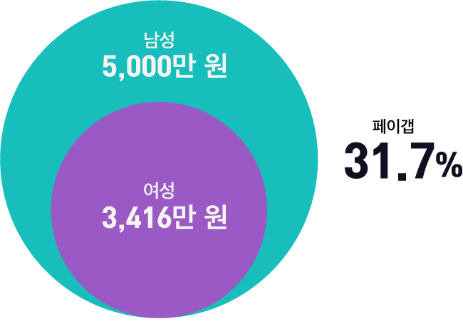 <마부작침>이 우리나라 2,441개 기업을 분석한 결과, 2017년 우리나라 기업 남성 직원의 연봉은 5,000만 원으로 집계됐다. 같은 기간 여성 직원은 3,416만 원을 받는데 그쳤다. 여성이 남성보다 1,584만 원이나 적게 받은 것으로, 페이갭은 31.7%나 됐다. 다시 말하자면, 남성이 100만 원을 벌었다고 했을 때, 여성은 남성의 68.3%(=100%-31.7%)인 68만 3천 원만 벌었다는 뜻이다.