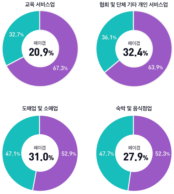 여성 직원의 수가 남성보다 두 배 더 많은 교육 서비스업의 페이갭은 앞서 언급했듯 20.9%로 분석됐다, 여성 비중이 64%에 육박하는 개인 서비스업의 페이갭도 32.4%다. 지난해 남성이 3,400만 원을 받을 동안 여성은 1,100만 원(페이갭 32.4%) 더 적은 2,300 만원에 그쳤다. 여성 직원이 훨씬 많은 산업에서도, 여성은 남성 소득의 68%에 그친다는 말이다.