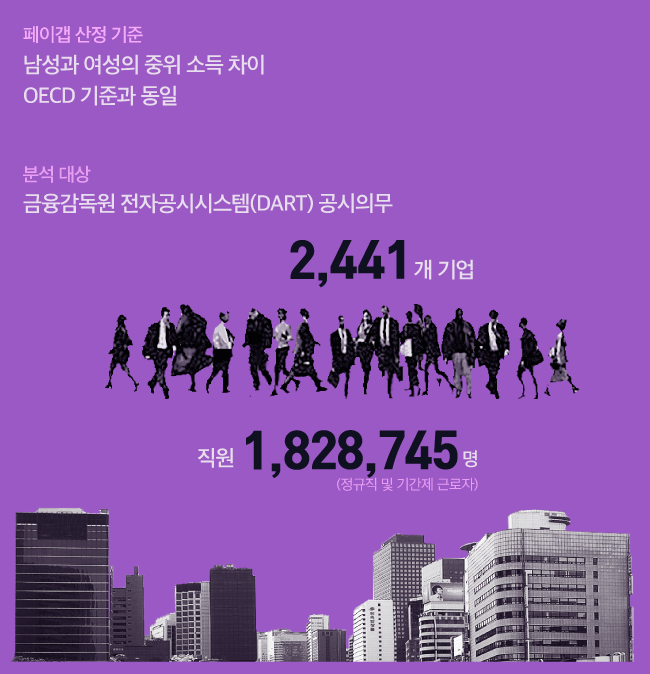 (※ 편집자주(註): <마부작침>은 금융감독원 전자공시시스템(DART)에 사업보고서를 공개한 2,590개(4,313개 사업 부문) 기업의 사업보고서와, 공공기관 경영정보공개시스템(ALIO)에 등록된 353개 공공기관의 경영보고서를 분석했다. 이 가운데 임금이 명백히 잘못 기재된 것으로 추정되는 기업 29개, 직원이 전부 남성 또는 여성만 있는 기업 120개 등 149개 기업은 분석 대상에서 제외했다. 결국, 분석 대상에 포함된 건 2,441개 기업(직원 183만 명)과 올해 공공기관에서 지정 해제된 1곳을 제외한 352개 공공기관(직원 32만 명)이다. 기업의 임직원 가운데 임원은 분석 자료가 없어 제외하고 직원만을 대상으로 분석했다. 페이갭을 기업들의 남녀 임금 평균으로 분석할 경우, 특정기업의 임금이 지나치게 높거나 낮을 경우 축소 또는 과장 해석이 가능하다. 이른바 '평균의 함정'에 빠질 수 있는 우려가 크다. 때문에 전체 기업의 남녀 임금을 크기 순으로 나열한 뒤 가장 가운데있는 중앙값(중위 임금)을 기준으로 분석했다. 경제협력개발기구(OECD)는 페이갭 수치를 산정할 때, 남성과 여성의 중위 임금 차이로 분석하는데, <마부작침>도 OECD 기준을 동일하게 적용했다.)