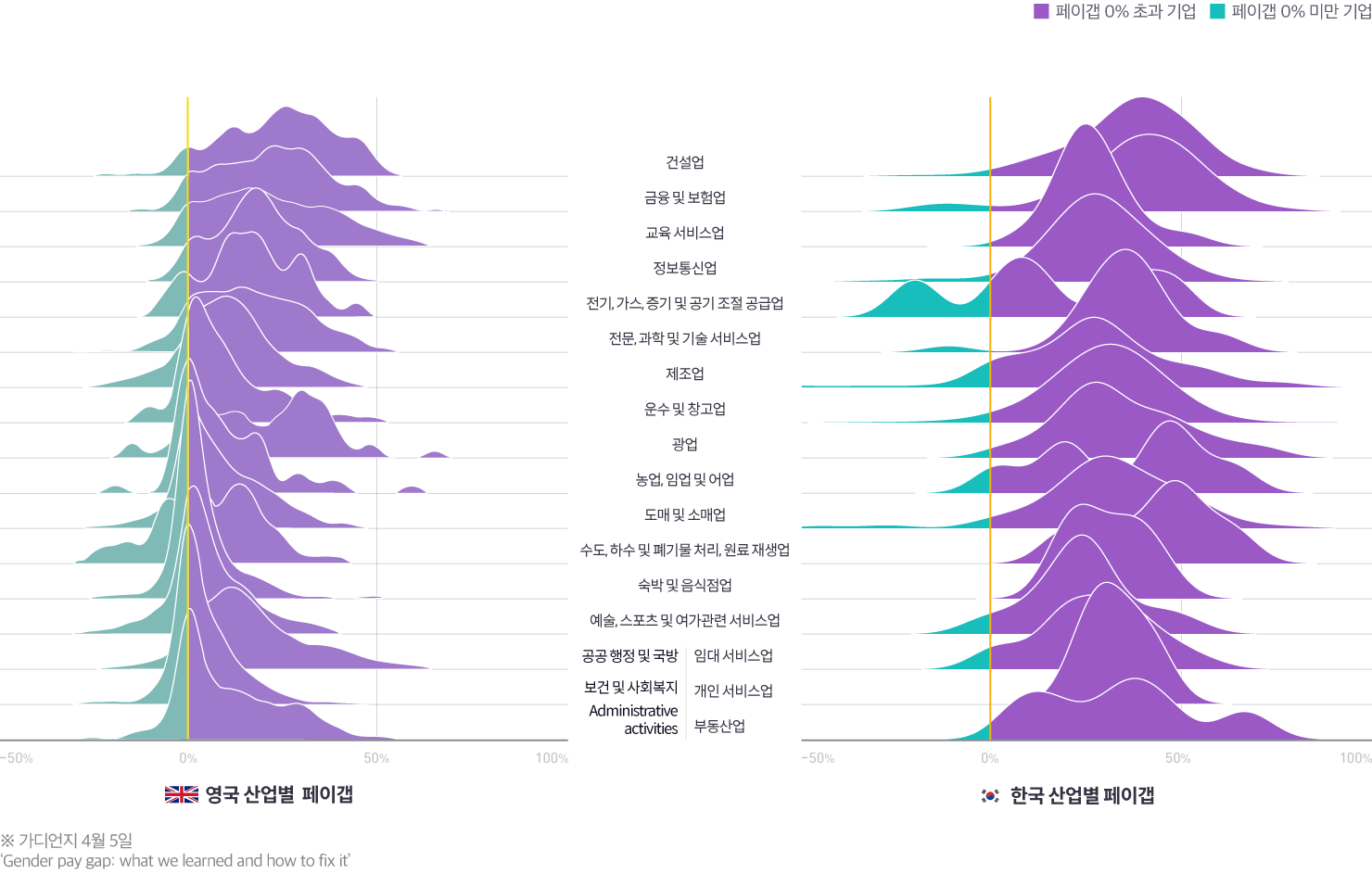그래픽을 보면 영국 역시 남녀 임금격차가 존재하지만, 그나마 페이갭이 '제로(0%)'인 가운데 구간에도 기업들이 다소 모여 있거나, 여성이 더 많이 받는 기업도 적게나마 존재한다. 반면 한국의 기업 대부분은 오른쪽, 즉 절대적으로 남성이 더 많이 받는 기업들로 채워져 있다. 분석 결과만 보면, '페이 미투(#PayMeToo)'는 사실 한국에서 더 먼저 시작됐어야 마땅해 보인다.