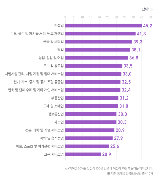 64개 분야 중 페이갭이 30% 이상인 산업은 42개, 40%이상 산업군도 9개에 달한다. 즉, 65% 이상의 산업군(42개)에서 심각한 남녀 임금 격차를 나타내고 있다. 그래픽에서 볼 수 있듯 금융 및 보험관련 서비스업, 임대업(부동산 제외)부터 음료제조업, 어업, 농업, 우편 및 통신업까지 다양한 분야에서 여성은 남성에 비해 훨씬 적은 임금을 받고 있다.
