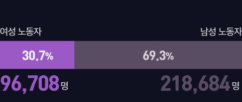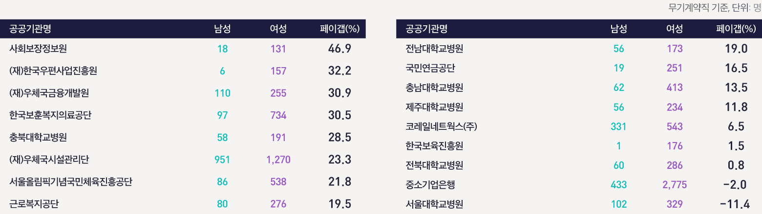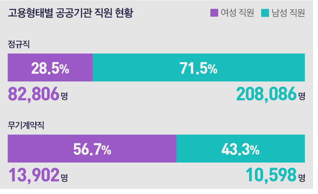 고용형태를 성비로 분류해보면, 페이갭의 원인이 더욱 잘 드러난다. 상대적으로 임금 수준이 높은 정규직 직원(29만여 명)에선 남성(71.5%)이 여성(28.5%)보다 2.5배 많은 반면, 상대적으로 저임금인 무기계약직에선 여성(56.7%)이 절반 이상을 차지한다. 민간기업과 마찬가지로, 공공기관 내에서도 여성이 저임금 일자리에 집중돼 있기 때문에 임금격차가 심화됐음을 알 수 있다.