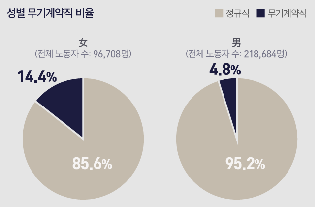 공공기관(352개)에서 근무하는 전체 남직원 21만 8,684명 가운데 정규직 남성은 20만 8,086명(95.2%), 무기 계약직 남성은 1만 598명(4.8%)이다. 반대로 전체 여직원 9만 6,708명 가운데 정규직 여성은 8만 2,806명(85.6%), 무기계약직 여성은 1만 3,902명(14.4%)이다. 남직원의 정규직 비율이 더 높다.