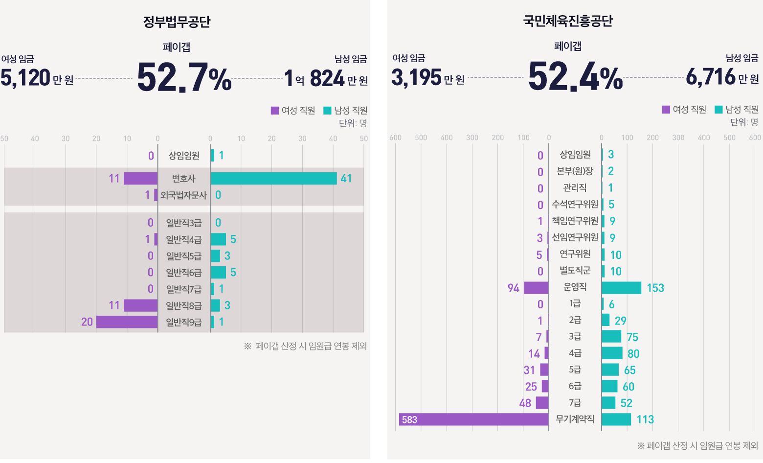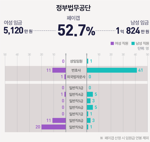 정부법무공단은 '남성 60명, 여성 42명' 모두 정규직으로, 고용형태가 같은데 남녀의 임금차가 두 배 이상 발생했다. 공단 측은 이에 대해 '직군 차이'라고 해명했다. 공단 관계자는 "법무공단은 변호사 직군과 일반 직군으로 구분되는데 변호사 직군의 임금이 일반직보다 많고, 변호사 직군에 남성이 많다"고 설명했다.