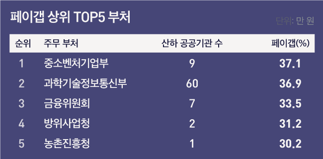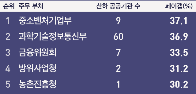 페이갭이 가장 큰 부처는 중소벤처기업부다. 기술보증기금, 중소기업진흥공단 등 모두 9개 공공기관을 관리하는 중소벤처기업부의 페이갭은 37.1%로 나타났다. 중소벤처기업부가 관리하는 9개 공공기관 중 직원 수가 1,192명으로 가장 많은 기술보증기금의 페이갭이 40.4%로 분석돼 부처의 전체 페이갭을 끌어올렸다. 중소벤처기업부는 산하 공공기관의 임금격차 이유로 남성 대비 여성의 하위직 쏠림 현상을 꼽았다. 해당 부처 관계자는 "임금격차에 대해 수시로 확인은 하고 있다"면서도 "부처가 공공기관 인사에 대해 강제적인 조정은 어렵고, 권고하는 수준"이라고 한계점을 드러냈다. 다만, 이 관계자는 "지난해 공공기관에서 여성 고위직 비율을 높이겠다고 발표했듯, 이런 정부 방침이 이행될 수 있도록 할 것"이라고 말했다. 35개 주무부처 중 가장 많은 60개 공공기관을 관리하는 과학기술정보통신부의 페이갭은 36.9%로 그 뒤를 이었다.