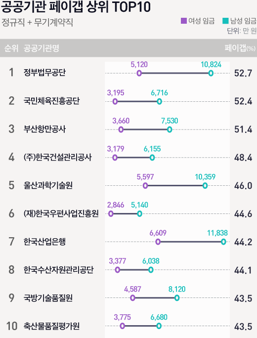 정부법무공단 다음으로 국민체육진흥공단, 부산항만공사, 한국건설관리공사 등이 심각한 페이갭을 보이고 있다. 이들 기관을 포함해 페이갭 상위 TOP 10 공공기관은 모두 임금격차는 40%대를 훌쩍 넘었다. 이들 기관들의 해명은 비슷했다. 대표적으로 국민체육진흥공단은 지난해 남성이 6,716만원을 받을 동안, 여성은 3,521만원(페이갭 52.4%) 더 적은 3,195만원을 받는데 그쳤다. 여성이 남성의 절반도 받지 못했다는 뜻이다. 국민체육진흥공단 관계자는 "높은 직급에선 남성 비율이 높고, 낮은 직급에선 여성 비율이 높기 때문에 남성 평균임금이 높다"라고 설명했다.