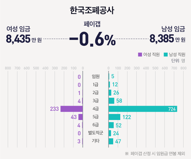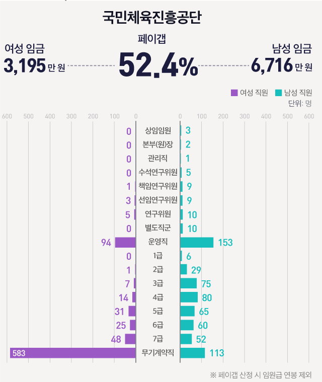 체육진흥공단은 특히 여직원 수가 남직원보다 6배 이상 많은 무기계약직에서도 심각한 페이갭이 존재했다. 이와 관련된 해명은 '직급'이 아닌 '직무'였다. "서로 다른 업무 때문"이라는 것이다. 공단 관계자는 "무기계약직은 직무에 따라 보수가 다른데, 발매 업무 같은 저임금 직무에 여성이 많아 여성의 평균임금이 낮다"고 말했다. '남성 628명, 여성 757명'으로 구성된 국민체육진흥공단에서 남성의 86.3%는 정규직, 여성의 71.2%는 무기계약직이다.